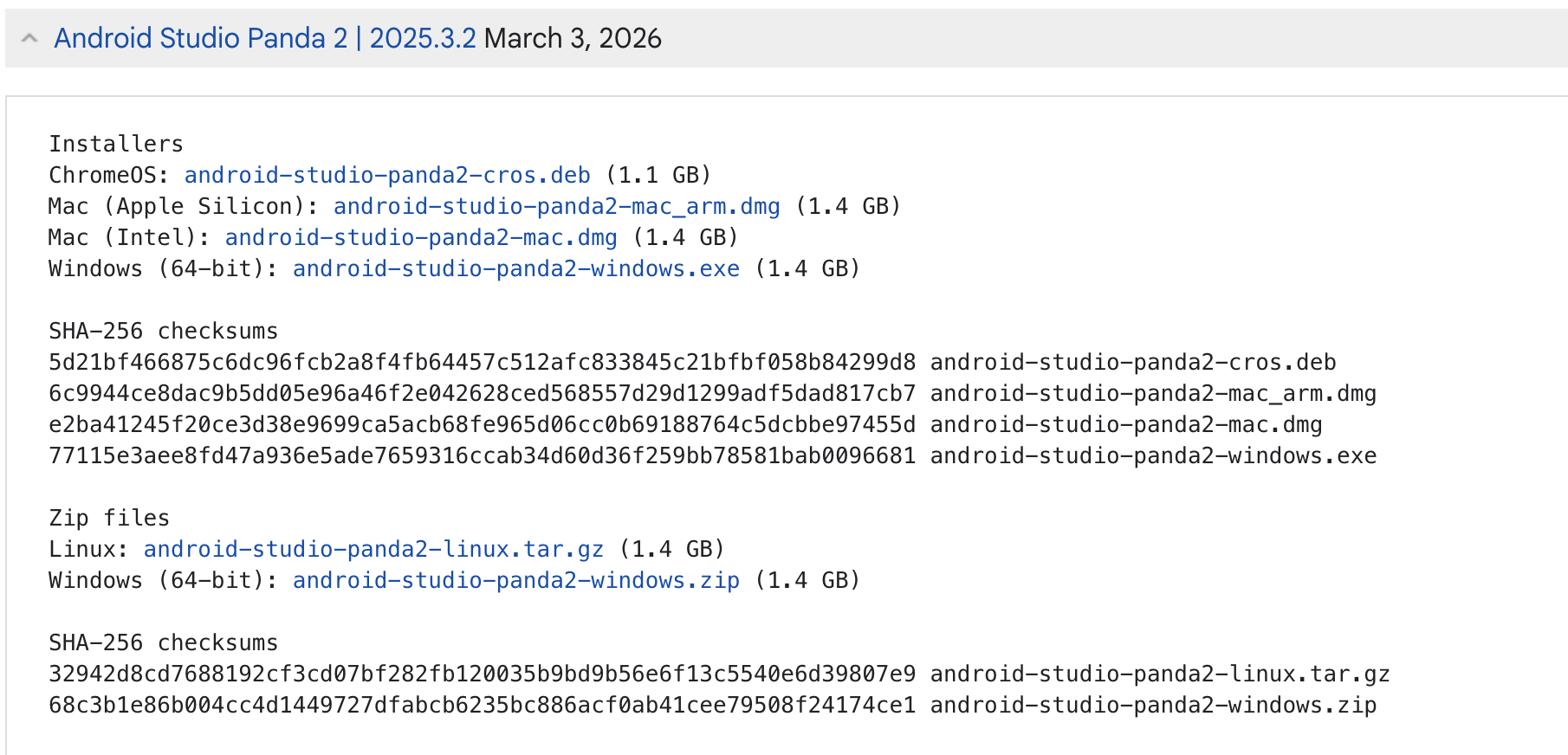 panda와 같은 코드명을 URL 문자열에 포함https://developer.android.com/studio/archive 에서도 동일한 모습을 확인할 수 있다