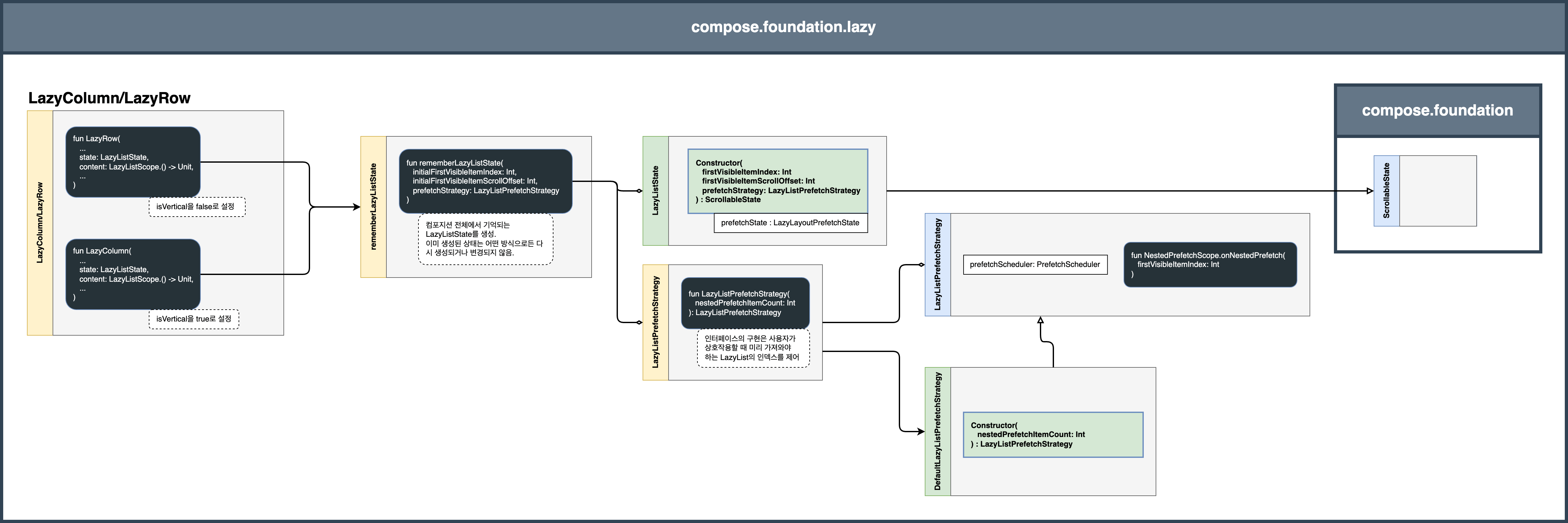 LazyColumn/LazyRow 둘 다 내부적으로 internal LazyList를 호출합니다. 2개의 차이점은 reverseLayout 파라미터에 따른 항목을 그리는 방향만 다르다라는 점입니다.