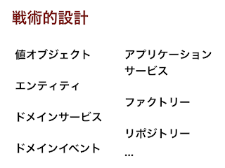 Value Object, Entity, Domain Service, Domain Event, Application Service, Factory, Repository, …